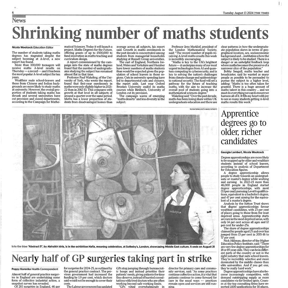 On Tuesday 13 August 2024, Nicola Woolcock, Education Editor for The Times, covered the shrinking number of maths students.